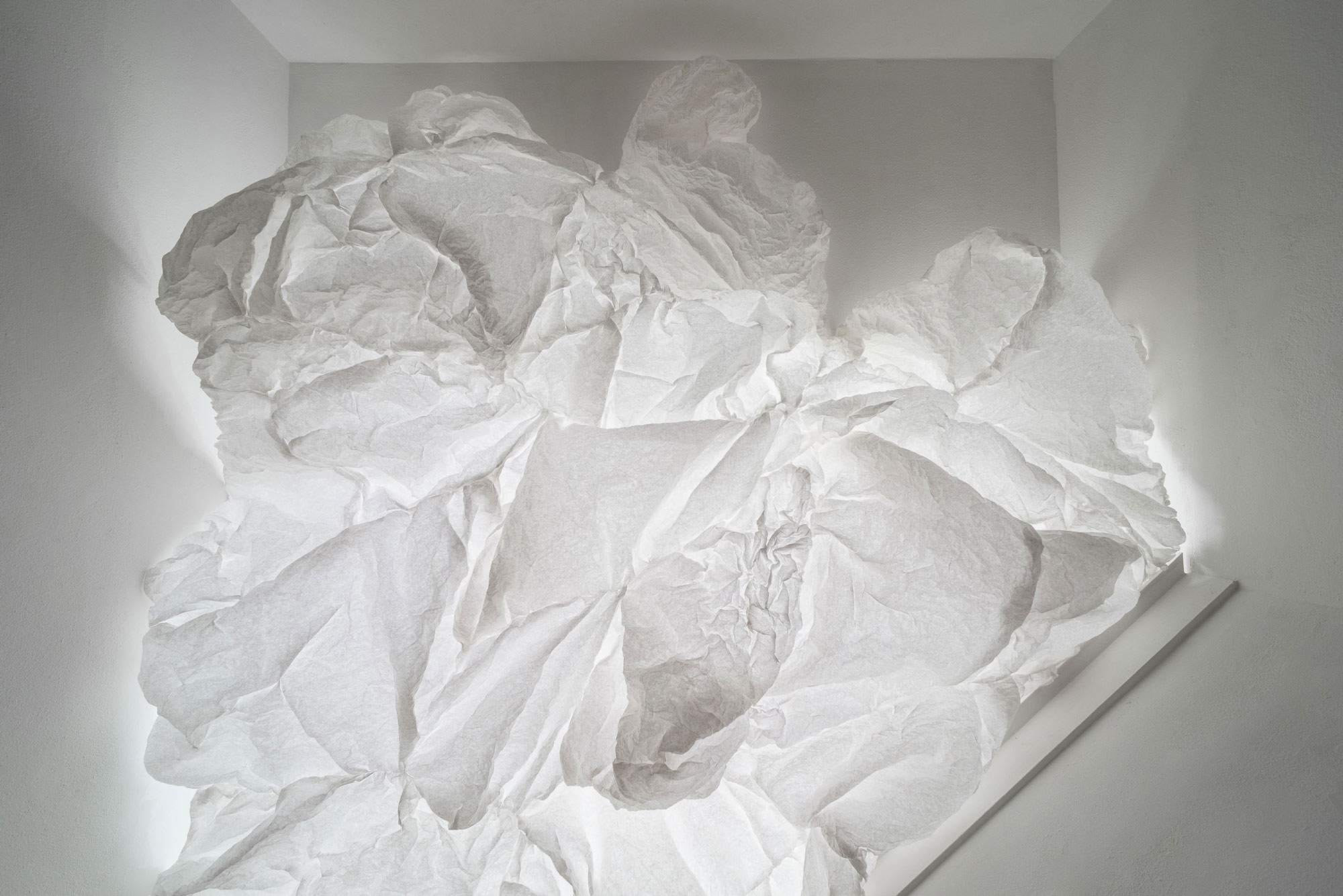 Paper Sky is a Bridge Project created in collaboration with Stuart Allen and Robert Amerman. Created by a group of 13 artists and non-artists, participants created 18 paper modules that make up the final installation. Adhering to specific structural constraints, each module exhibits individual artistry in the variety of folds and contours. Constructed with humble materials – bond paper, wire and staples (lots and lots of staples) – the completed installation is surprisingly transformative. Building on the strength found in numbers, the group’s collective effort yields a result that is greater than the sum of its parts.